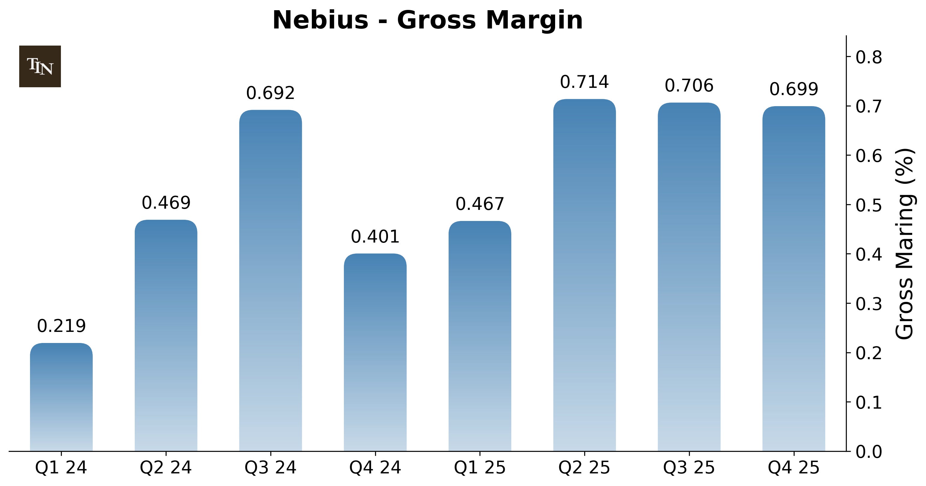 The ~70% gross margin in Q4 2025 is the number that deserves attention. GPU cloud businesses generate high gross margins because once infrastructure is procured and depreciated, incremental compute capacity carries very low variable cost. The margin improving from the low 60s to approximately 70% as Nebius scales reflects the operating leverage of filling contracted capacity at long-term rates, customers who have committed to multi-year contracts at premium pricing rather than competing on hourly spot rates.