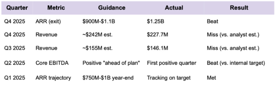 The execution pattern here is easy to misread. The quarterly revenue misses look concerning until you understand what drives them: analysts repeatedly struggle to model the timing of capacity deployment, and new data center tranches that go live later in a quarter contribute one month of revenue rather than three. The company consistently beats its own internal ARR guidance, which is the metric management actually controls and emphasizes. Management has explicitly noted that analysts still don’t fully understand how to model this business. The ARR beats are what matter operationally.